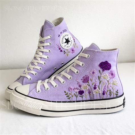 Embroidered Converse, Wedding Flowers Embroidered Shoes For Bride, Converse Embroidery Floral, Bridal Purple Flowers Embroidered Sneakers