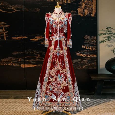 Chinese Traditional Wedding Bridal Stylish Long Cheongsam Dress Elegant Bride Dragon Phoenix Vintage