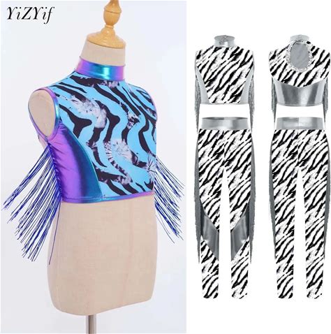 2Pcs/Set Kids Girls Jazz Hip-Hop Dance Outfit Mock Neck Long Sleeve Front Shiny Sequin Metallic Crop