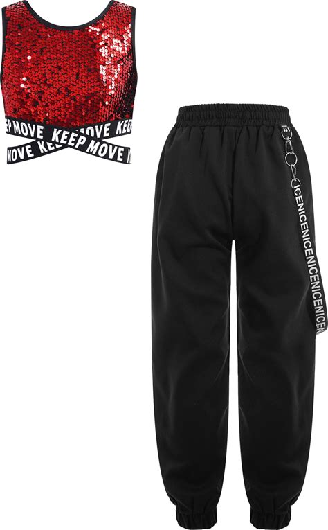 Kids Girls Dance Costume Jazz Hip Hop Dance Set 2 Piece Shiny Rhinestone Crop Top And Wide-Leg Pants
