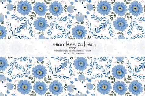 Blue Folk Floral Seamless Pattern, Scandinavian Wildflower Design, Hand Painted Watercolor Flowers, Nordic Cottagecore Surface Pattern, Jpeg