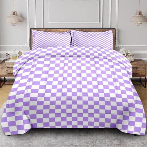Plaid Checkerboard Grid Violet Purple Quilt Comforter Set Full Size, Checkered Geometric Lavender Check Pattern Soft Bedding Sets Comforter With 2